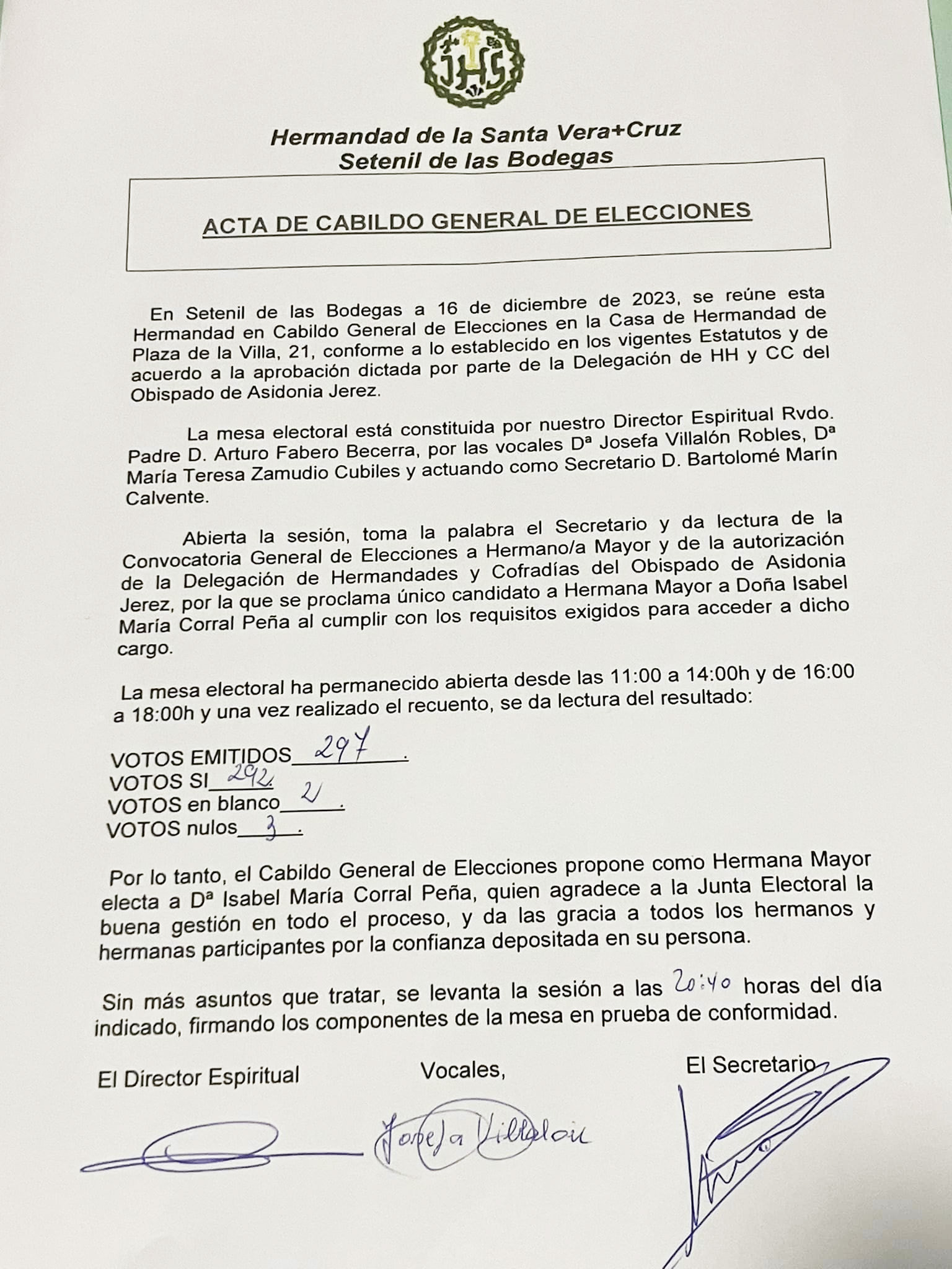 Finalizado el Cabildo de Elecciones celebrado este sábado 16 de dieimbre de 2023, la candidata Isabel María Corral Peña ha sido elegida Hermana Mayor electa con 292 votos SI, 2 votos en blanco y 3 votos nulos. Próximamente tomará posesión del cargo y relevará a Sebastián Luque.